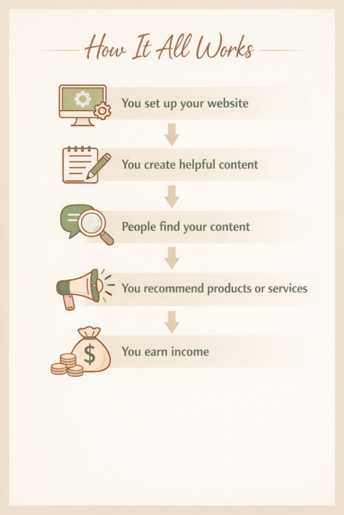 You start by setting up your website — your space online where everything lives. Then you create helpful, valuable content that answers questions or solves problems for your audience. Over time, people find your content through search engines or platforms like Pinterest, and begin to trust what you share. From there, you can naturally recommend products or services that support what they’re looking for. When they take action, you earn income.
